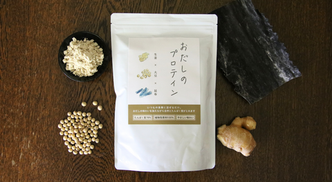 これまでの「シェイクして飲む甘いプロテイン」ではなく、どんな料理にも入れられる、甘くない「おだしのプロテイン」です。大豆×生姜×昆布×酵豆粉。
